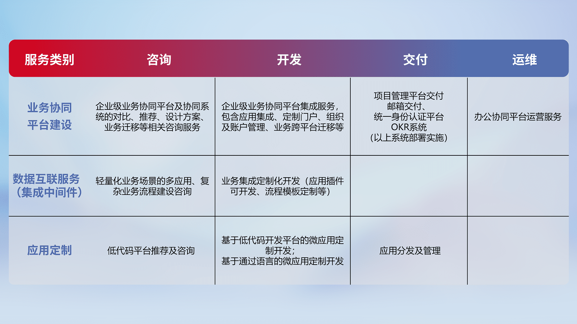针对钉钉、、、、企微、、、IDaas等平台级产品提供产品的规划、、、方案、、交付、、、定制化开发等服务,,,实现如统一协同办公、、、、智能客户服务、、、、混合会议管理、、、智能数据查询、、、、等业务场景,,,实现数字化转型。。。
